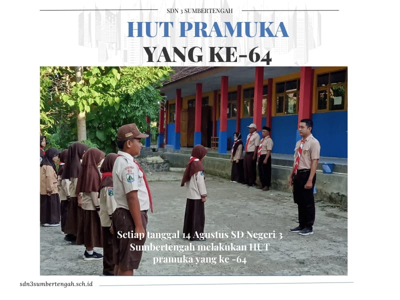 Seluruh Siswa SDN 3 Sumbertengah hari ini memperingati Hari Ulang Tahun (HUT) Gerakan Pramuka ke-64 dengan penuh semangat dan antusiasme. Acara yang dilaksanakan di halaman sekolah ini berlangsung meriah dan sarat makna, mengusung tema nasional "Pramuka Tangguh, Indonesia Maju".
